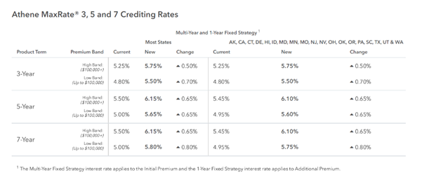 October 26, 2023 Important Levinson Carrier News and Updates – 10/26/23 … Athene Athene 6.15% for 5 Years GUARANTEED! Athene is raising rates effective October 27, 2023! 6.15% for 5 Years ($100k+) (Most States) 5.75% for 3 Years ($100k+) Athene is rated ‘A’ by AM Best! Available up to age 85 Interest Only Withdrawals